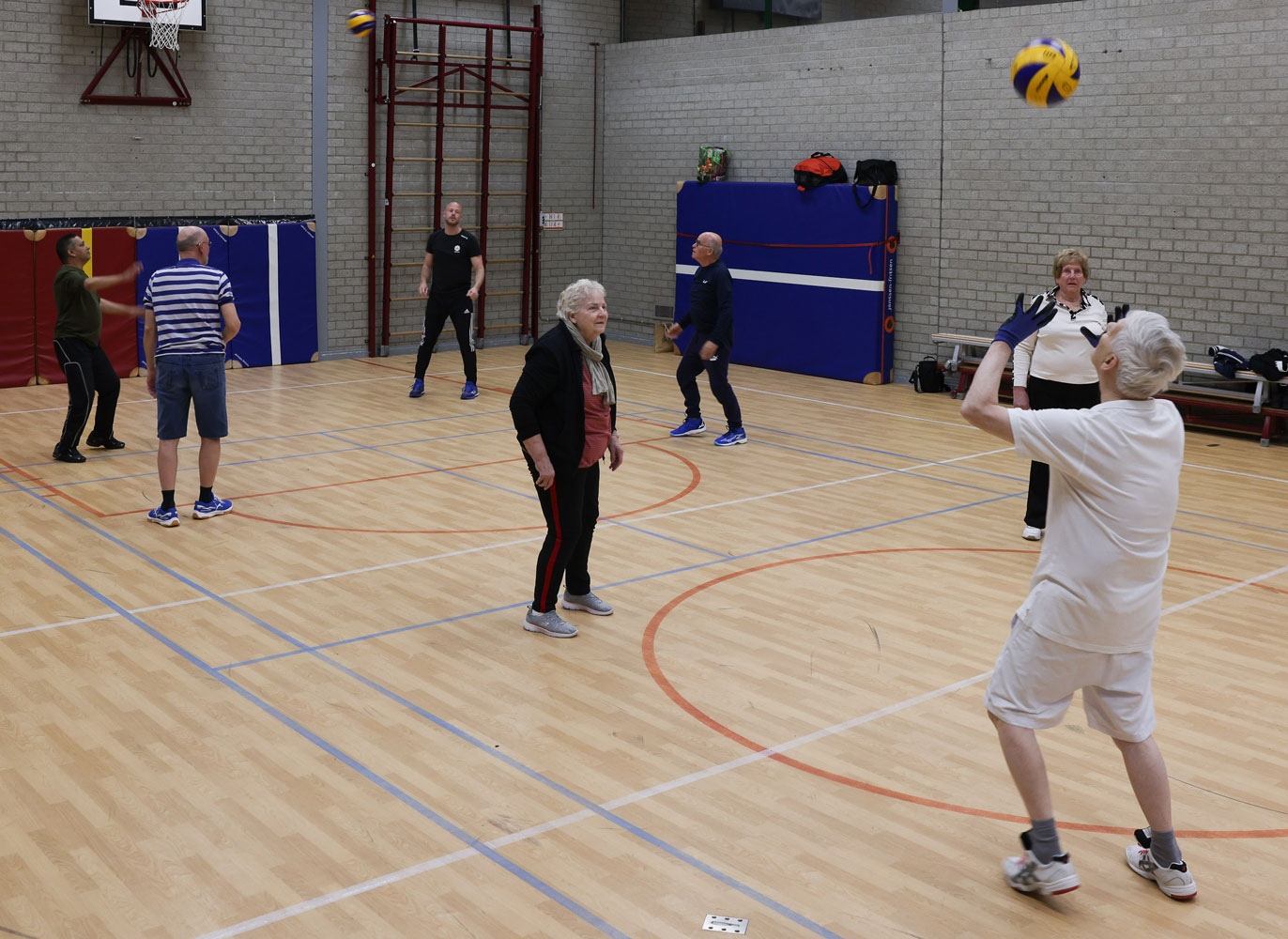 Starten met een goede warming-up en vervolgens verantwoord volleyballen met aangepaste regels.