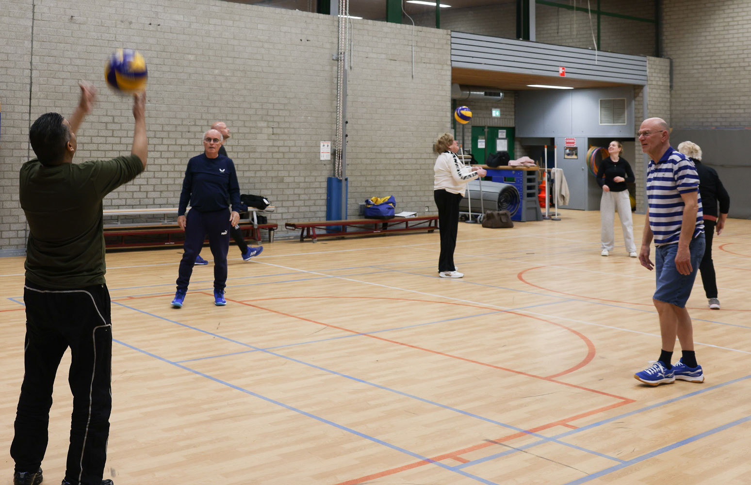 Starten met een goede warming-up en vervolgens verantwoord volleyballen met aangepaste regels.